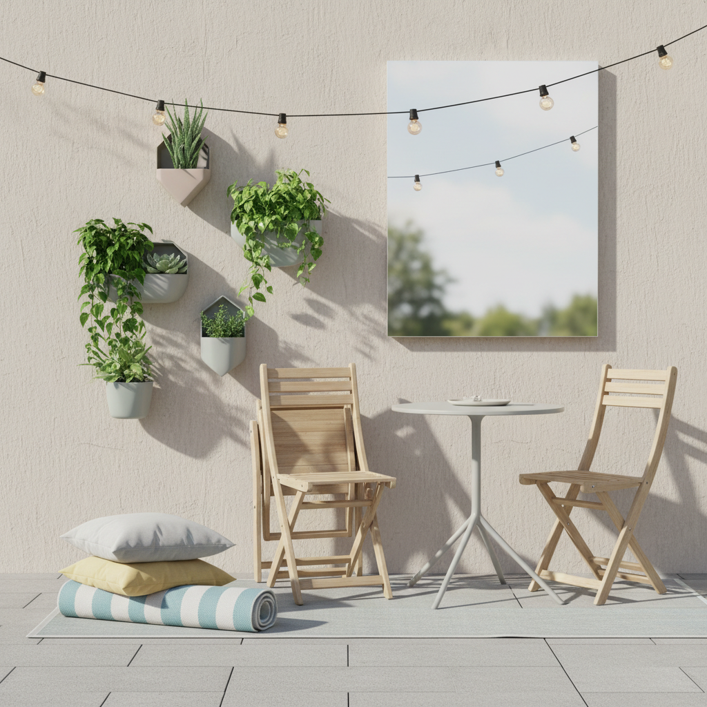 Renkantis dekoratyvines pagalvėles ir šiltus pledus vėsiems vakarams, patariama laikytis profesionalios „trijų spalvų taisyklės“, kad erdvė nebūtų per daug marga ir nevargintų akių. Pasirinkite vieną pagrindinę neutralią spalvą, kuri atsispindės stambiausiuose balduose, ir dvi derančias akcentines spalvas, kurias naudosite tekstilėje bei smulkiose dekoracijose. Taip pat nevenkite ir nestandartinių sprendimų, pavyzdžiui, veidrodžių. Nors jie dažniausiai naudojami tik vidaus interjere, lauko sąlygoms pritaikytas veidrodis, pakabintas ant sienos taip, kad atspindėtų žaliuojančius augalus ar gražų dangaus vaizdą, sukurs papildomo lango ir kur kas didesnės erdvės iliuziją. Minimalizmas ir erdvės taupymas nereiškia, kad terasa turi būti tuščia ar nuobodi; tai reiškia, kad kiekvienas daiktas, pradedant paprasta sulankstoma kėde ir baigiant šviesos girlianda, turi būti pasirenkamas sąmoningai, siekiant sukurti tobulą vizualinės harmonijos ir kasdienio patogumo balansą.
