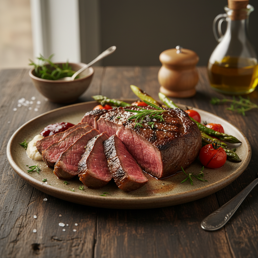 Jei norite vienodo iškepimo, galite naudoti dvigubą būdą – pirmiausia trumpai apskrudinkite keptuvėje, tada dėkite į 180 °C orkaitę. Kepimo laikas priklauso nuo kepsnio storio – paprastai 10–15 minučių yra pakankamas. Nepamirškite naudoti termometro, nes jis leis išvengti spėlionių.
