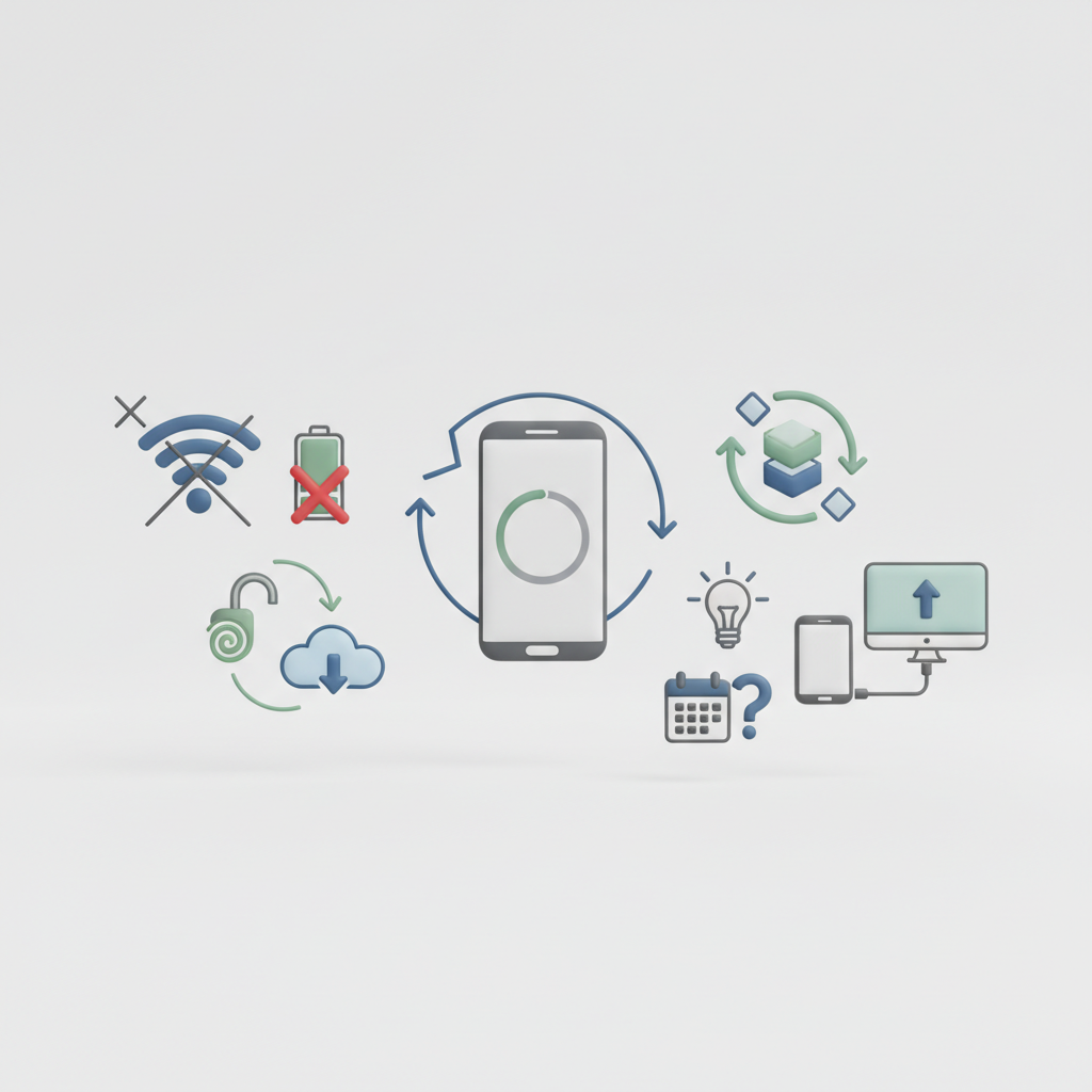 Nors šiuolaikiniai duomenų migravimo įrankiai yra patikimi, kartais procesas gali sustoti arba nutrūkti. Jei matote, kad progreso juosta nejuda ilgiau nei 15 minučių arba gaunate klaidos pranešimą, neišsigąskite. Dažniausiai problemą išsprendžia paprasti veiksmai.