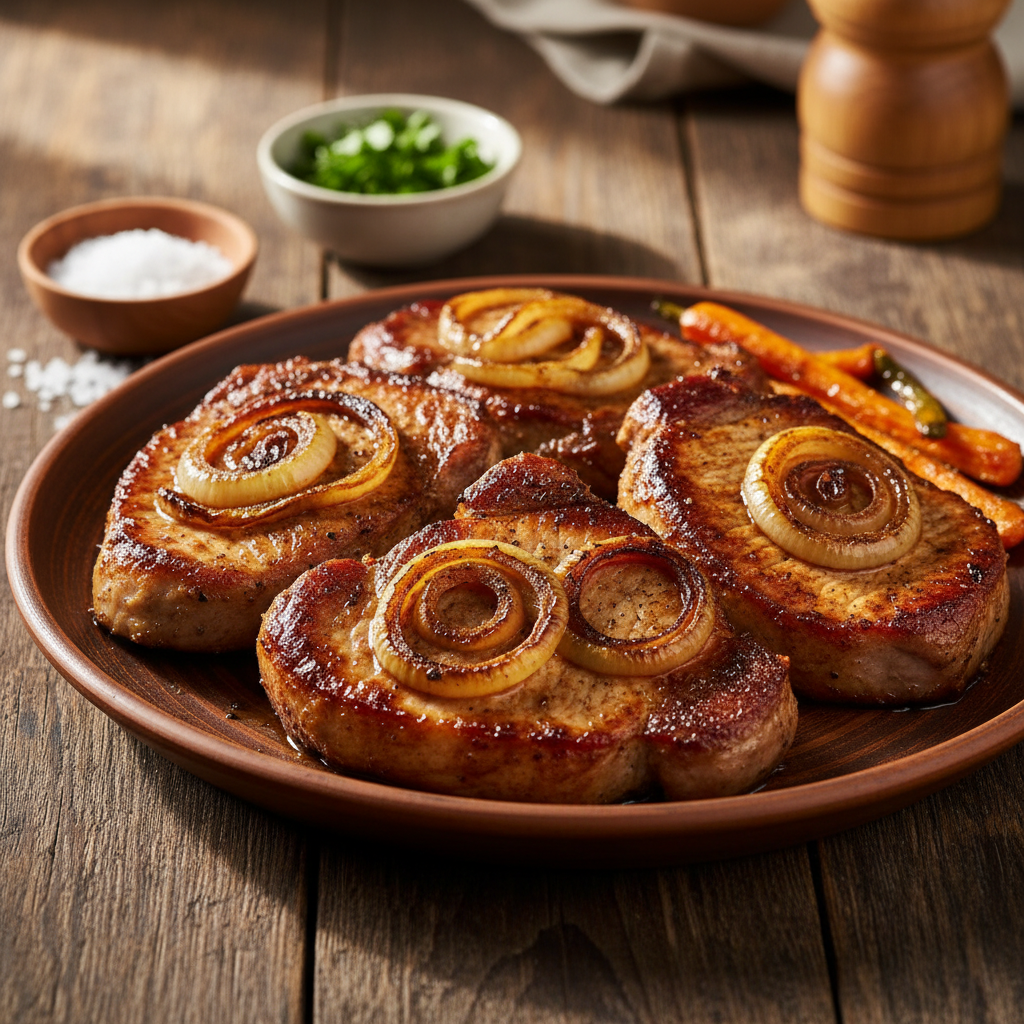 Nuimkite foliją. Padidinkite temperatūrą iki 200–210°C arba įjunkite grilio funkciją (būkite atidūs, kad nesudegtų). Kepkite dar apie 15–20 minučių, kol kepsniai įgaus gražią, auksinę rudą spalvą. Svogūnai turėtų karamelizuotis.
